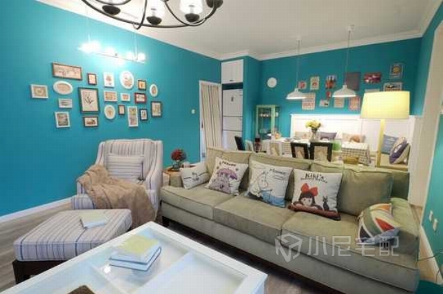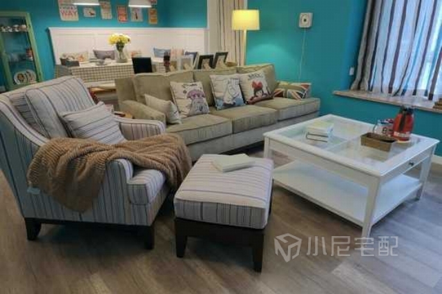 淺色調(diào)的三人布藝沙發(fā)和老虎凳搭配白色茶幾。給這藍(lán)色的海洋帶來一點點的明快與干凈。