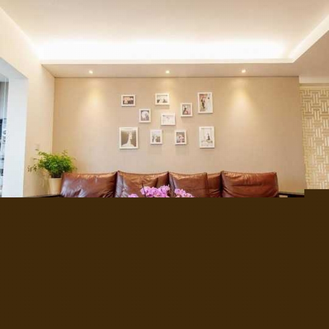 沙發(fā)背景墻作為了展示小夫妻婚紗照的照片墻。深色的皮沙發(fā)增加了整個(gè)空間色調(diào)的重量。
