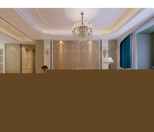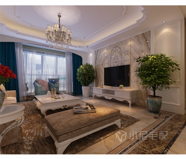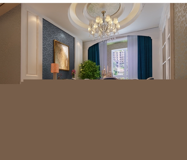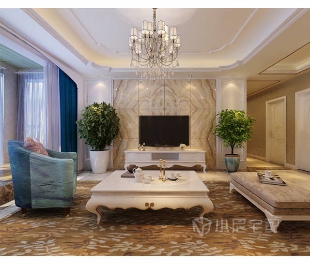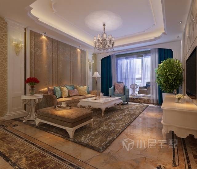 客廳藍色窗簾和水晶燈的搭配讓整體色調清爽一些。