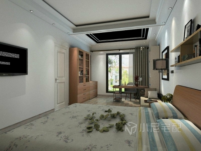 另一個視角看次臥室,吊頂將其一分為二,劃分出來一個獨立的辦公休閑區(qū)。