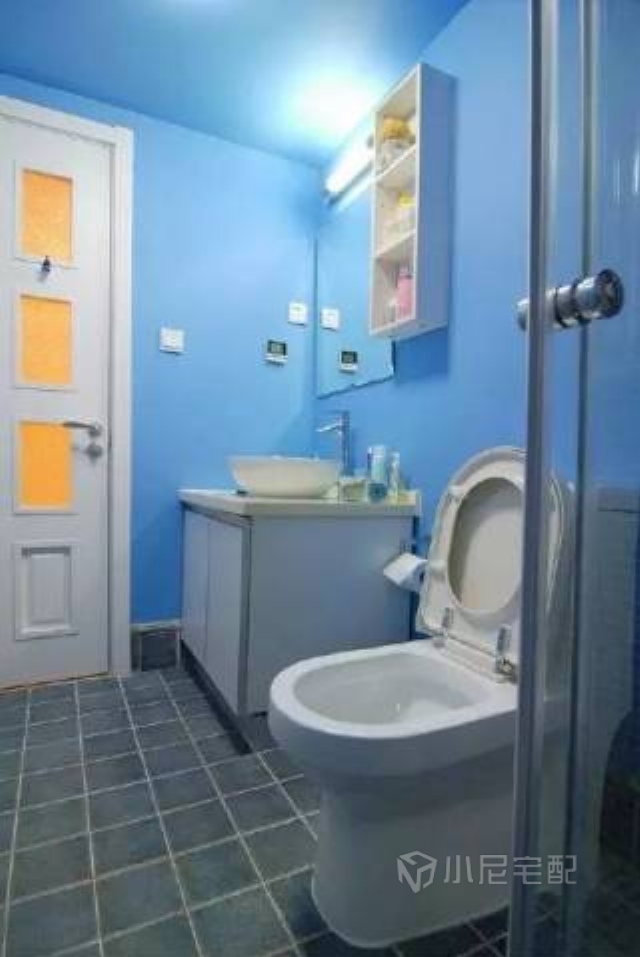 衛(wèi)生間的墻壁是藍(lán)色的,顯得干凈整潔一些,洗手池上方還有一個(gè)放置洗漱用品的小架子,物品的拿取非常方便奧。