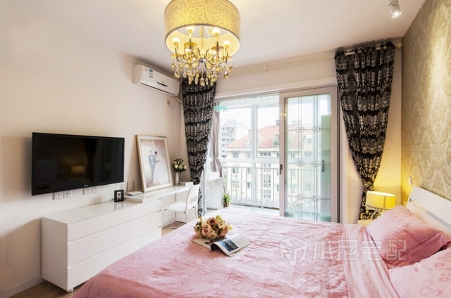 主臥的家具選擇統(tǒng)一的白色,金色壁紙,搭配粉色的床上用品。
