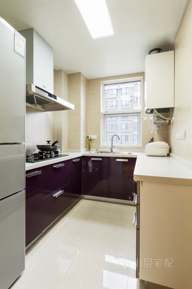 廚房不大,白色臺面搭配紫色柜體,有一股淡淡的高貴感。