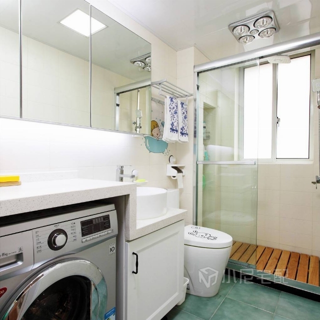 洗衣機和臺盆共用一個高低臺面,整潔又強大。淋浴房里放了浴室地板,洗澡不用穿拖鞋。