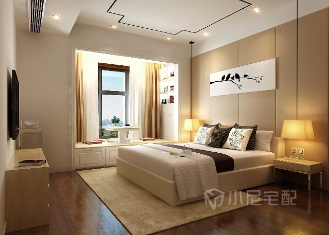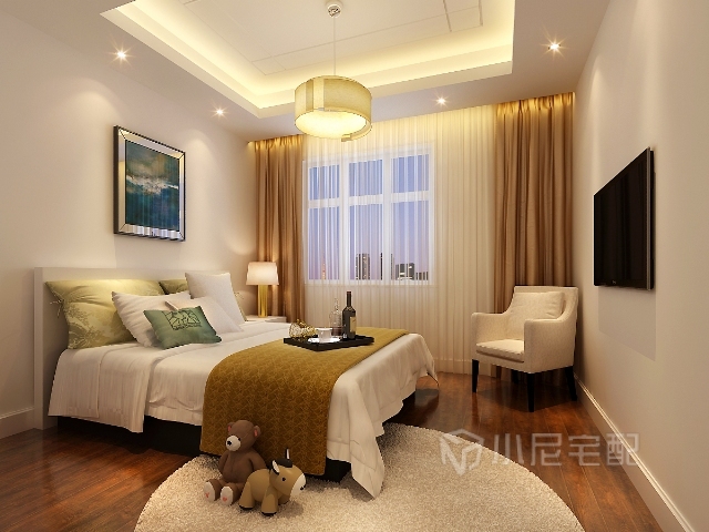 臥室與客廳在色調(diào)上非常柔和,橡木色的飾面板本身可以給人溫馨的感覺,大量軟包的利用給人酒店式的華麗感,和裝飾畫讓整個空間活靈活現(xiàn),再通過一些燈光的點綴,使得整個臥室充滿了溫馨,雅致的氣息。再加上家具和軟飾的和諧統(tǒng)一,使的整個空間時尚簡約但又不失奢華。