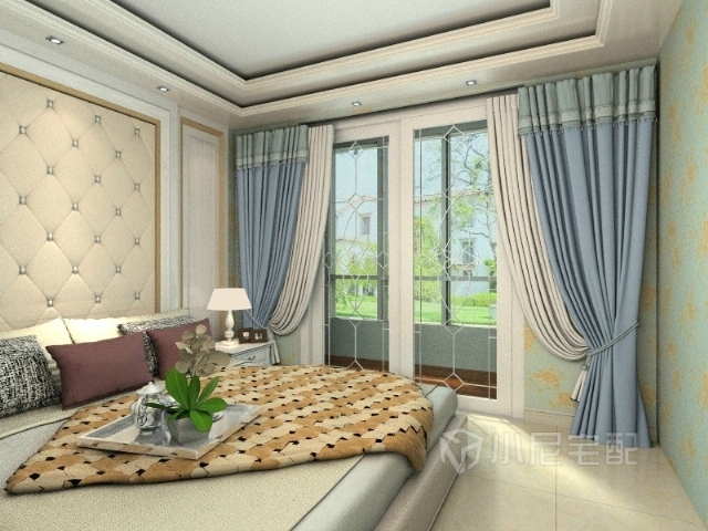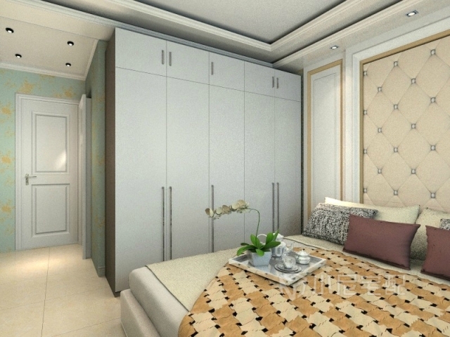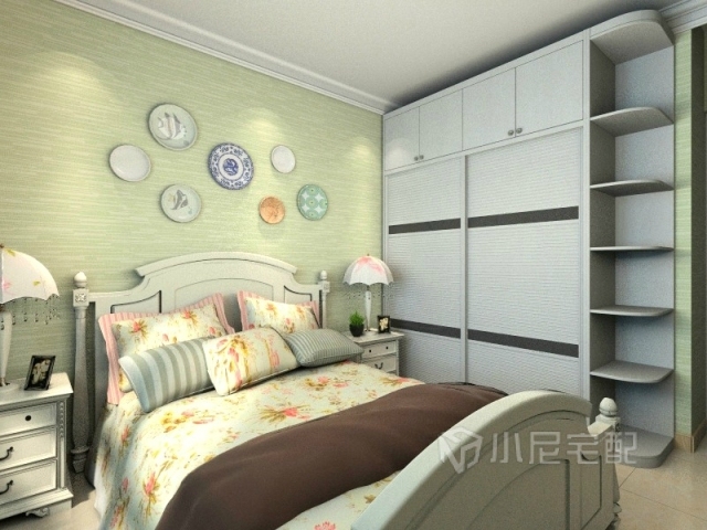 主臥用軟包做了個(gè)床頭背景,簡(jiǎn)單的吊頂,小田園式的壁紙。