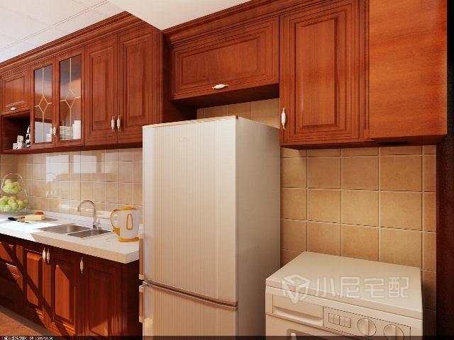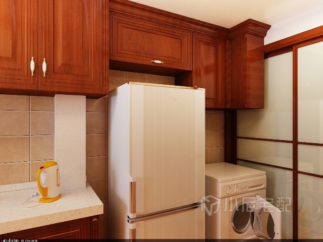 展現(xiàn)的是一個廚房的大角度,吊柜做了半開放式搭了兩扇玻璃門起到畫龍點睛的作用是整個廚房更加有風格。