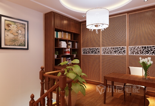 書房在樓上的位置開放式的儲物位置,以木色書衣柜推拉門非常協(xié)調(diào)