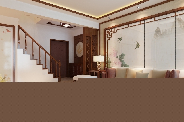 沙發(fā)背景墻用同木色的中式花格卸料了中式韻味
