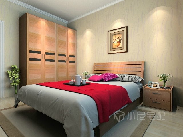 主臥的基調(diào)是樸實,不管是吊頂,還是原木色的大床,都帶著簡明的顏色和線條。