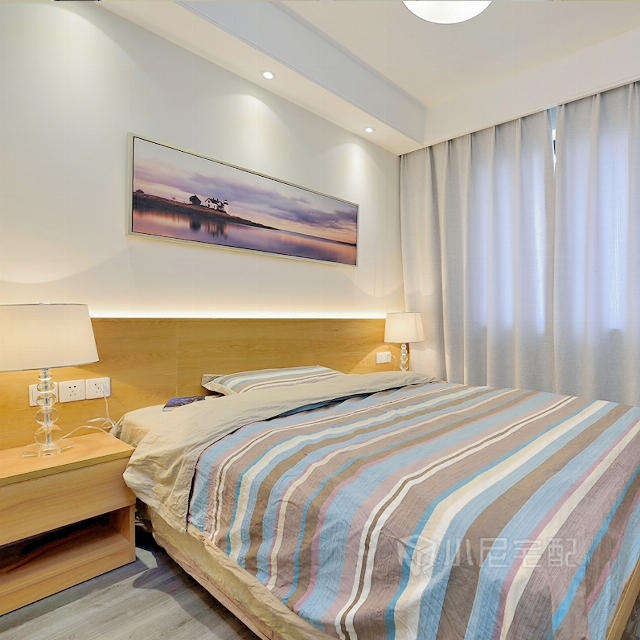 主臥的被套枕頭都是黃色的,很亮眼的顏色,墻體掛畫較為淺淡,和諧美好。