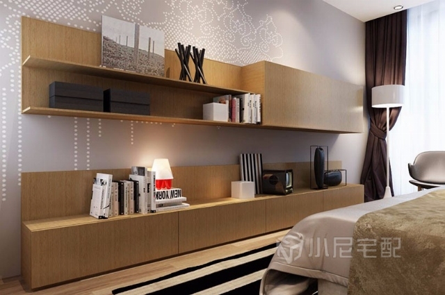 臥室:簡單的木紋地柜吊柜充斥著每一個空間,業(yè)主喜歡看書,特備的在臥室做了長條柜子。