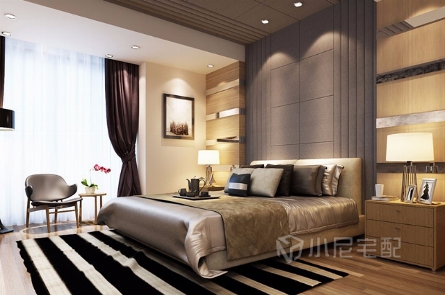 臥室:臥室背景采用咖色硬包,搭配鏡面不銹鋼,現(xiàn)代軟床,黑白相間的地毯,使整個空間溫馨時尚感倍增。