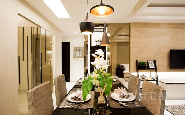 拉伸電視墻線條,茶色的烤漆玻璃做的紅酒柜,既美觀又實(shí)用。