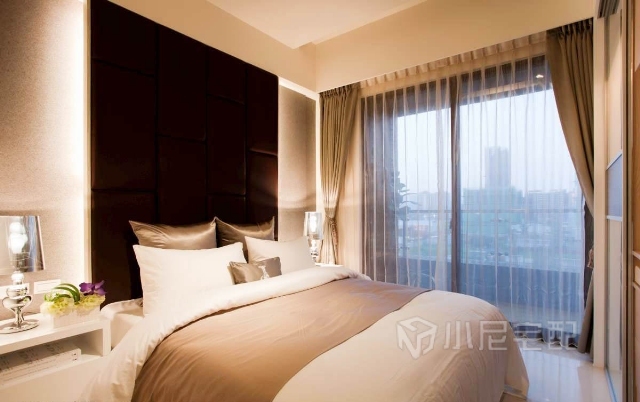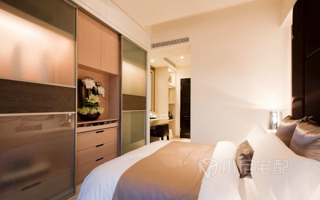 干凈立面上搭配深色繃布主墻,加上后方光源的烘托,突出主臥氣勢(shì)。