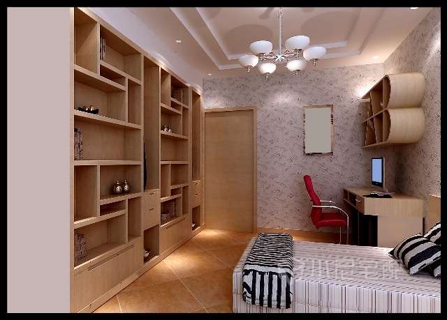 次臥整體較溫馨,必不可少的工作臺,還有大容量儲物柜用來收納各種生活用品。