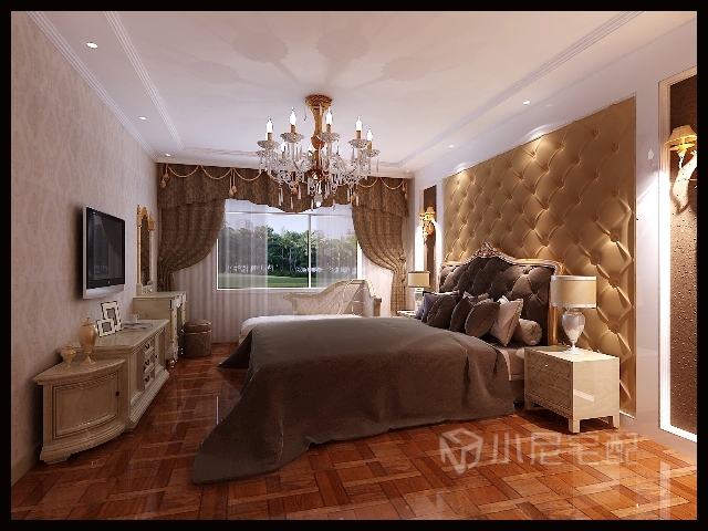 主臥背景墻用了女主人喜歡的軟包,鋪陳不同層次的浪漫,讓人仿佛徜徉在皇宮中。