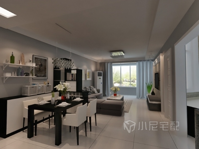 客廳鋪設淺色地磚,選用深色家具穩(wěn)定空間。
