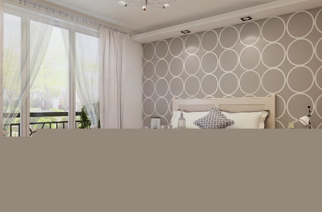 灰色圓圈的壁紙顯得輕松活潑,與床和床頭柜干凈利落的線型成對比,增加了空間的幾何感。