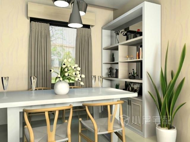 白色的餐邊柜和餐桌,幾何形狀的金屬吊燈,自然和諧