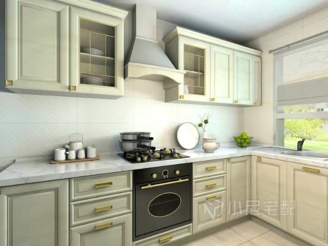 簡(jiǎn)約的廚房,白色的臺(tái)面,乳白色的飾板,使得整個(gè)廚房顯得干凈寬敞
