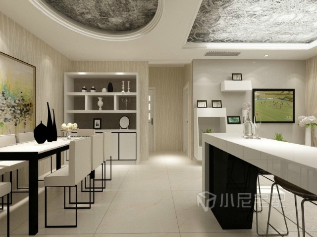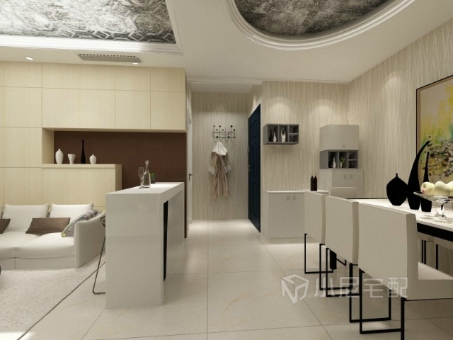 客廳的陳設(shè)增加了一個吧臺,也起到一個分隔的作用,同時滿足現(xiàn)在年輕人的生活品味,沙發(fā)背景墻的設(shè)計別致又切合整體布置,顏色搭配相呼應(yīng)。