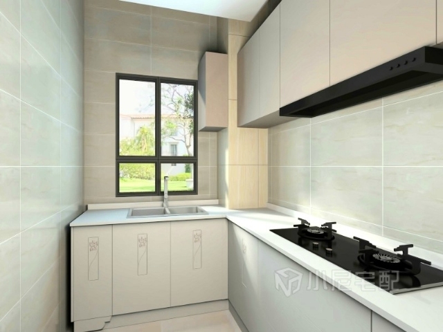 廚房也配合整體色調(diào)用了白色,L型廚房使小空間有了更多的實用功能。