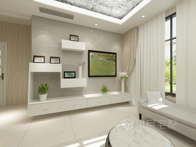 電視墻比較簡單,幾個不同層次的掛柜放一些裝飾擺件,趣味十足,一排抽屜柜增加實用性。