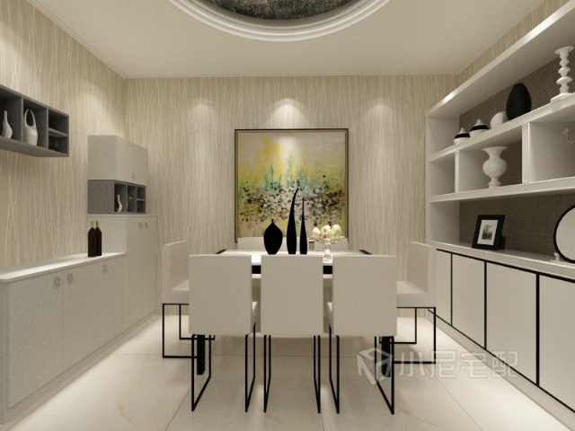 餐桌椅顏色與整體色調(diào)相搭配,兩側(cè)配有餐邊柜,墻壁上的裝飾畫畫龍點睛,用餐氣氛濃郁。