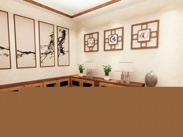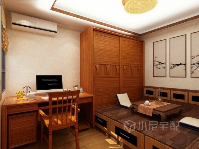 布置中式榻榻米,既可做書房又可做臥室,還可做茶室,水墨畫和木質(zhì)框架畫框營造書房雅致,家居的顏色也偏重一些,突出書房安靜穩(wěn)重的氣氛,使生活的實(shí)用性和對傳統(tǒng)文化的追求同時得到了滿足。