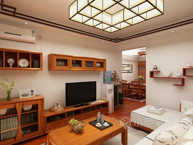 客廳:以木質(zhì)家居為主,但不是復(fù)古式的桌椅,而是富有現(xiàn)代感的沙發(fā)和茶幾。除了保留中式的韻味外,還加了玻璃、燈帶等現(xiàn)代材料,使空間又包含了現(xiàn)代生活氣息;光源上使用簡潔幾何燈具,大量采用自然光;在家具搭配上主要取材于自然,以木材為主。