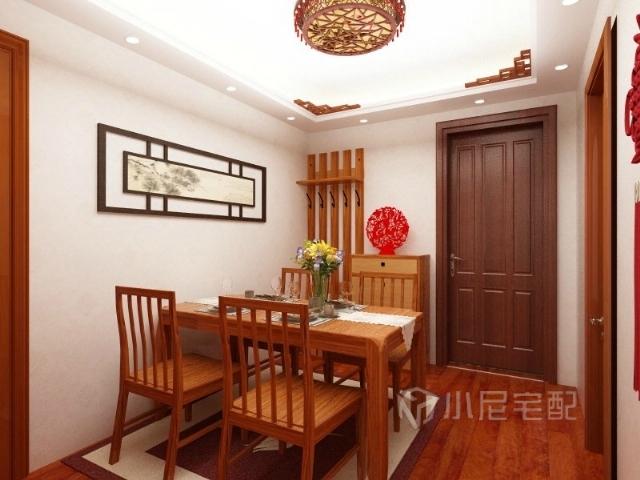餐廳:使用木材家具,更烘托家居生活的溫馨,避免了現(xiàn)代家居帶來的冰冷感,同時營造中式氛圍。入門處鞋柜用鏤空做裝飾,原木色調(diào)與室內(nèi)家具統(tǒng)一,擺設(shè)采用紅色的中式元素。