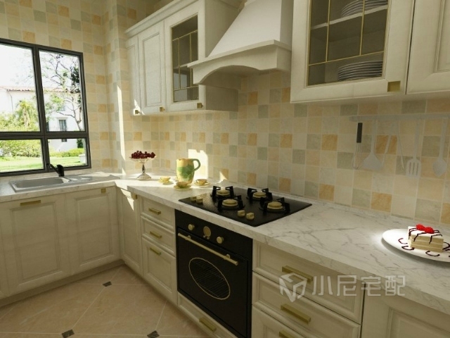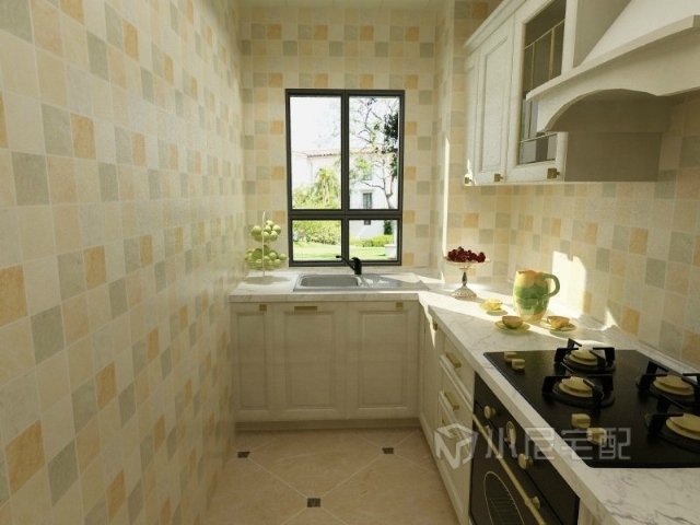 廚房要具備功能強大又簡單耐用的功能,有容納廚具、餐具的寬敞位置和足夠的操作臺面,裝飾上選用淺色的黃棕綠相間的墻磚,充滿田園的清新和大自然的氣息。