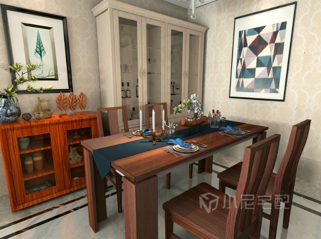 安靜的木質(zhì)復(fù)古色與歡快的跳舞蘭,一動一靜,圓形的裝飾盤,呼應(yīng)了餐廳的空間。
