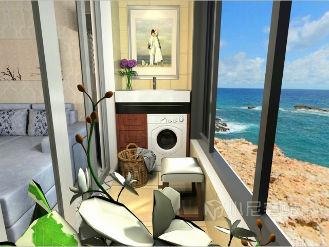 充滿了花香氣息,洗衣臺在那,靜靜等待中坐在板凳上望一望窗外