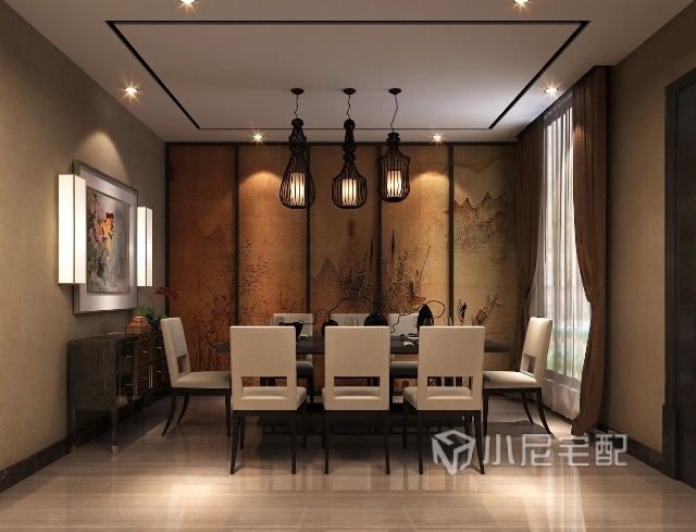 古典的屏風(fēng)樣式來裝飾墻面,可顯其古典韻味,與現(xiàn)代桌椅的結(jié)合相得益彰。