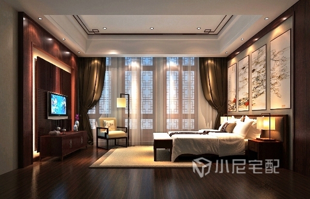 臥室秉承了傳統(tǒng)古典風(fēng)格的典雅和華貴,暗紅色的衣柜,木原色的床頭柜以及原木色的地板,還有電視背景墻以菊花來裝飾,徒增了高貴的氣息,整體顯示出的富貴、高雅。