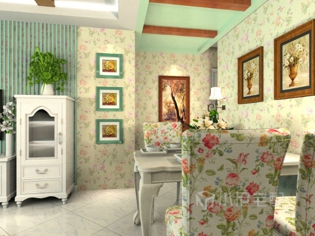 田園風(fēng)是一種大眾裝修風(fēng)格,其主旨是通過裝飾裝修表現(xiàn)出田園的氣息,該案例通過大量的裝飾畫,綠植來體現(xiàn)。