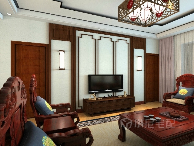 電視墻摒棄傳統(tǒng)的中式花格,簡(jiǎn)單大方
