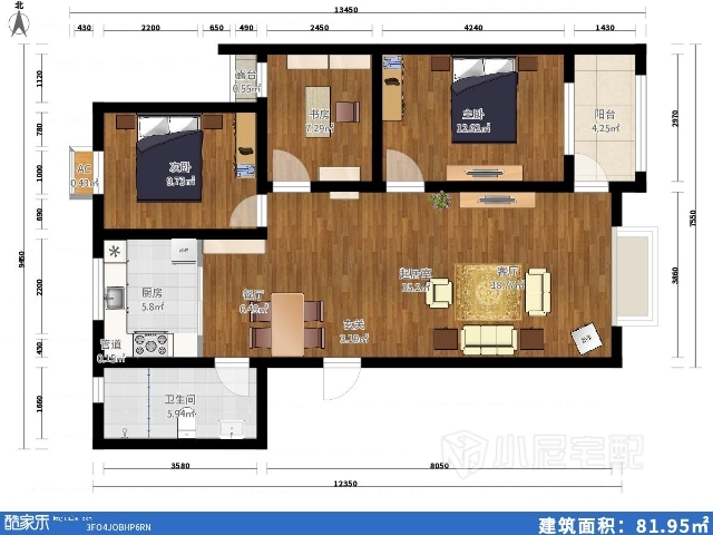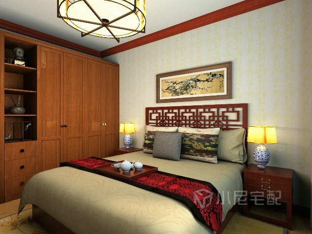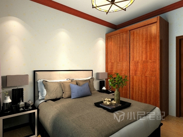 主臥實(shí)木頂角線,實(shí)木衣柜配實(shí)木床,可以看出臥房主人的儒雅