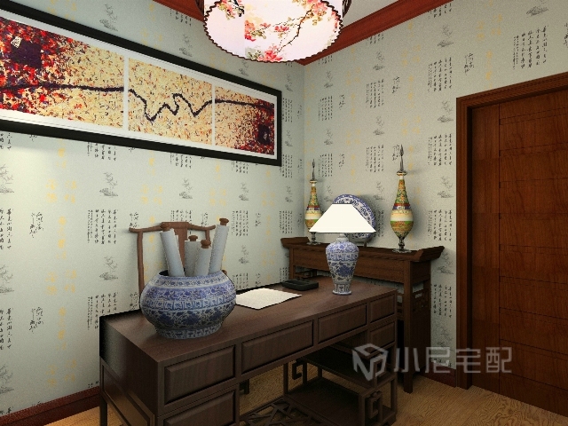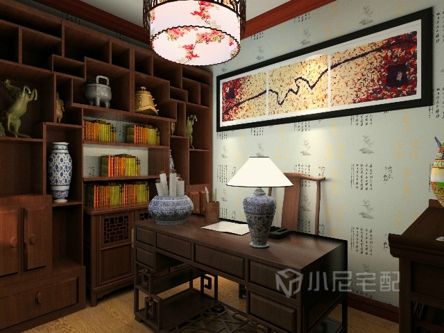 書(shū)房旁邊一個(gè)老榆木書(shū)柜,后面是簡(jiǎn)單裝飾畫(huà),墻面中式壁紙。帶著中式的清靜感