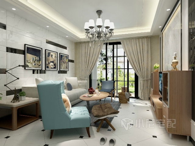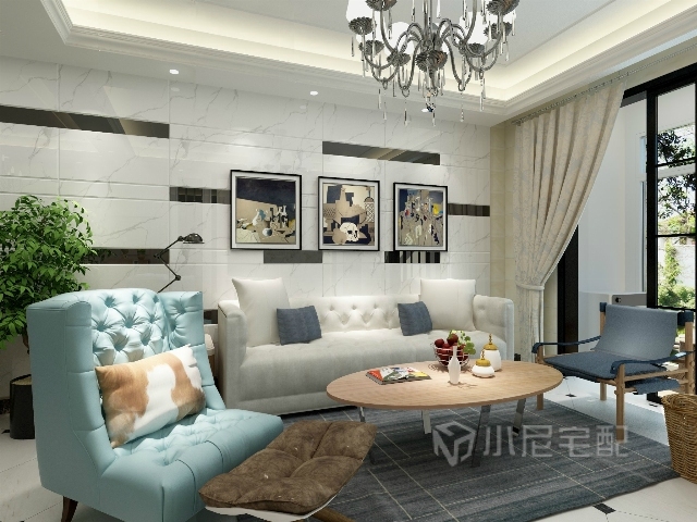 從另一個角度觀賞客廳,采光十分充足,窗簾采用了淺色調(diào)來搭配,乳白色的窗簾搭配藍色的單人沙發(fā),微風(fēng)吹過,感覺就像帶著淺淺的海洋氣息。