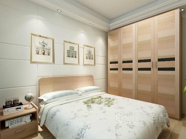 白色的簡約的背景墻,搭配現(xiàn)代裝飾畫,金絲胡桃的家具增加了臥室的溫馨。
