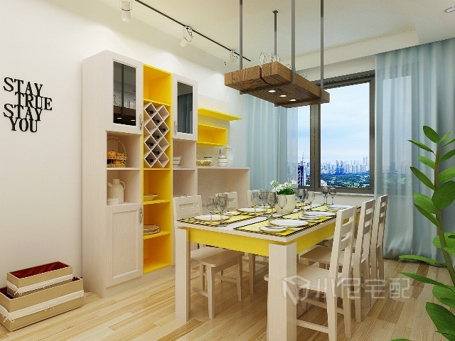 六人的長桌適合聚餐,家庭聚會,酒柜的設(shè)計(jì)增加裝飾和儲物的功能。