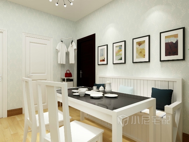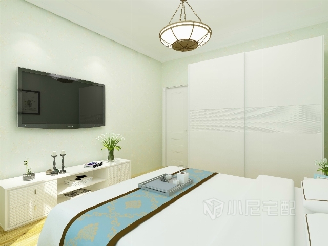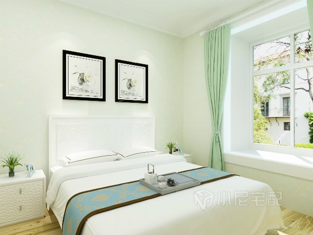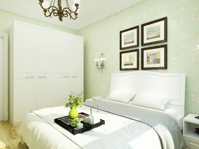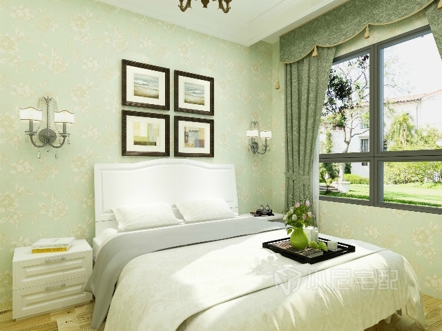 淡綠色的壁紙顯得清新脫俗,裝飾畫(huà)和壁燈裝飾床頭墻,白色的家具別具一格,簡(jiǎn)約大方。