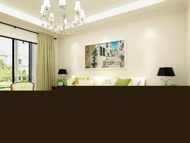 綠色的沙發(fā)抱枕和窗簾相呼應(yīng),白色的布藝沙發(fā)黑色的邊幾,舒適又時(shí)尚。