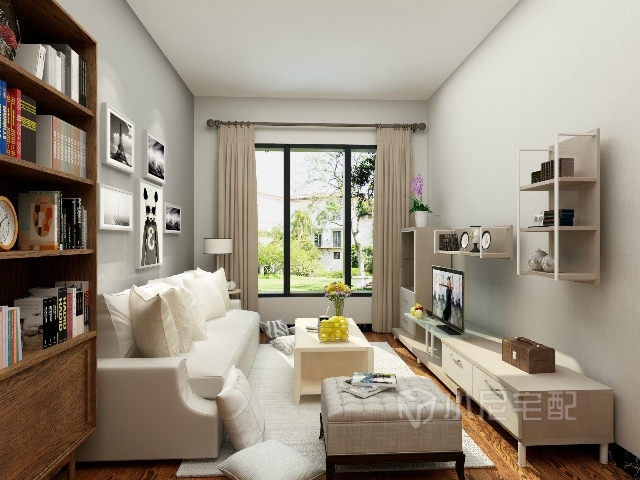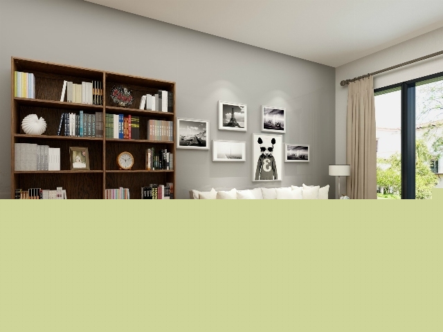 深色實木大書架,白色簡約沙發(fā),個性的照片墻,體現(xiàn)知性的文藝氣息。