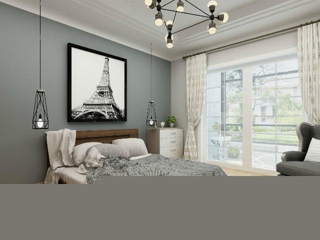 臥室選用低矮的床,灰色的墻面,現(xiàn)代的吊燈,時尚又個性。