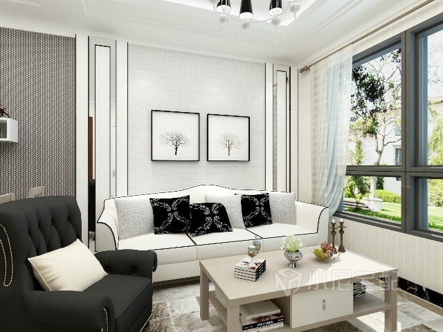 現(xiàn)代的背景墻,簡約的裝飾畫,黑白搭配的沙發(fā)顯得干凈利落。