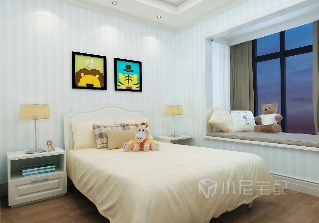 淡淡的藍(lán)色條紋壁紙,卡通裝飾畫(huà),安靜中又有俏皮的活潑感。